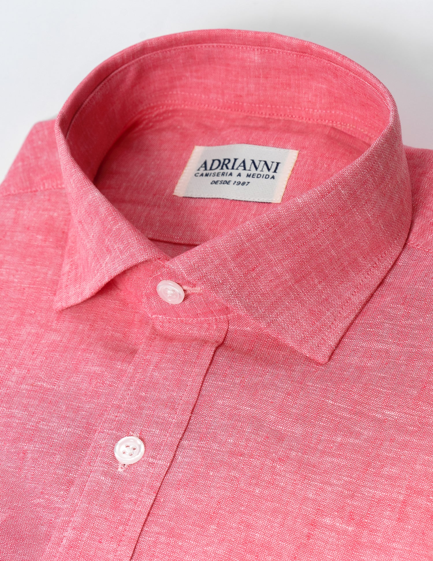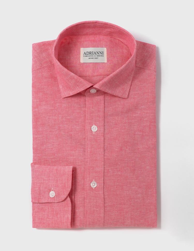 Confeccionada en tejido mixto de algodón y lino, esta camisa en tono coral aporta un matiz más abierto y luminoso, manteniendo equilibrio entre frescura y comodidad.