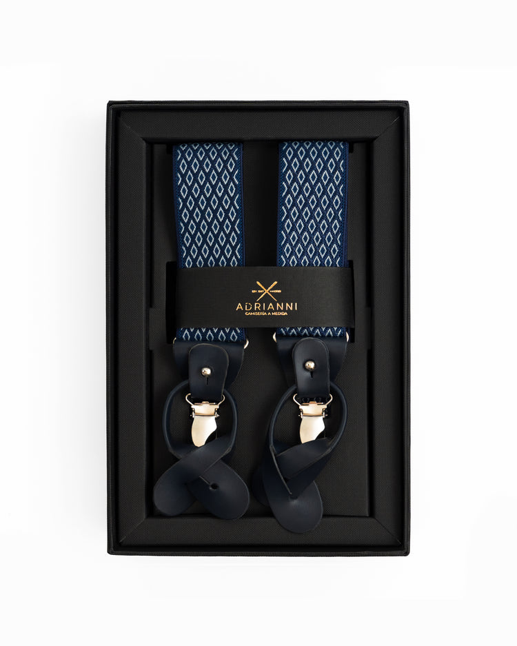 Tirantes fondo azul y rombos blancos