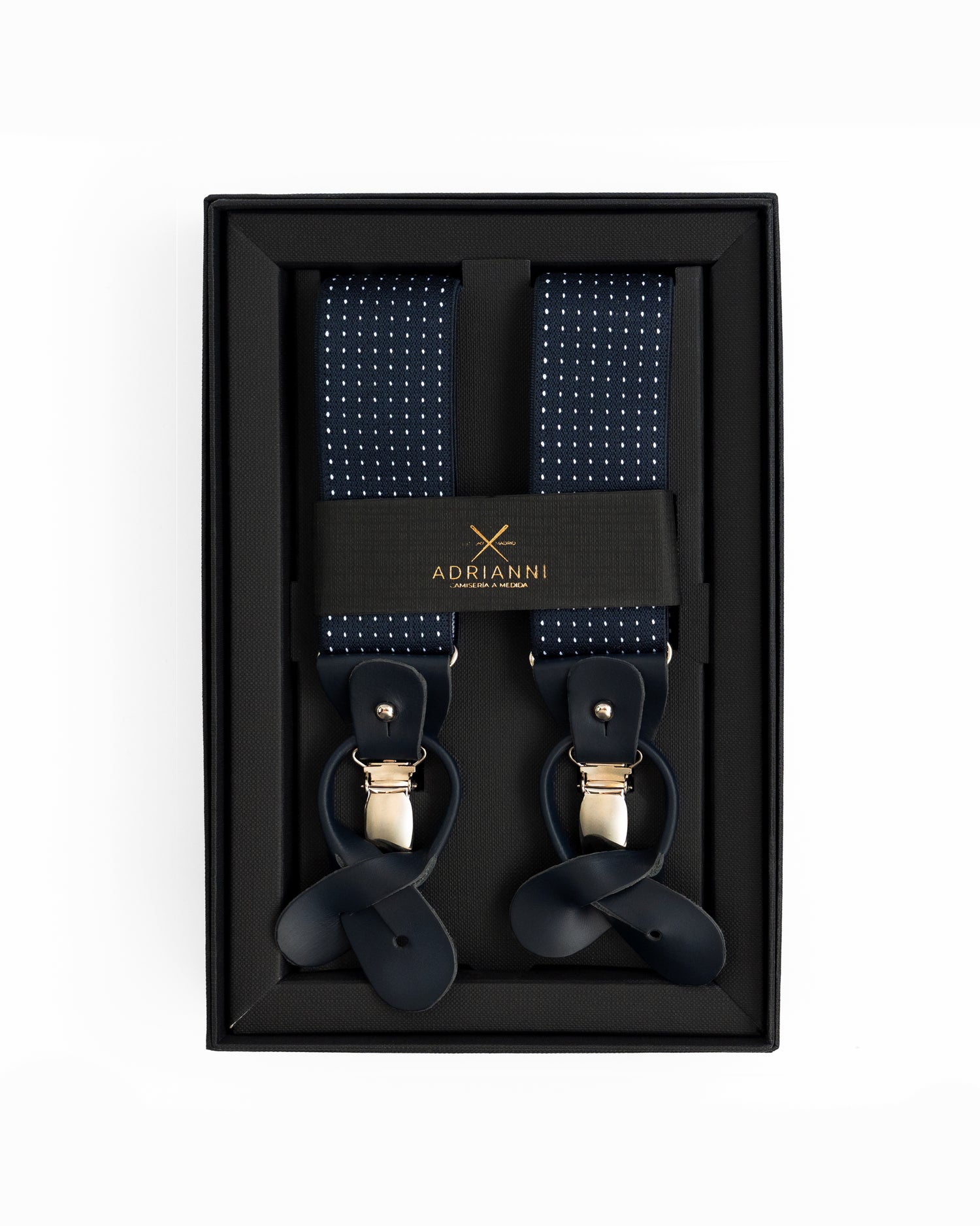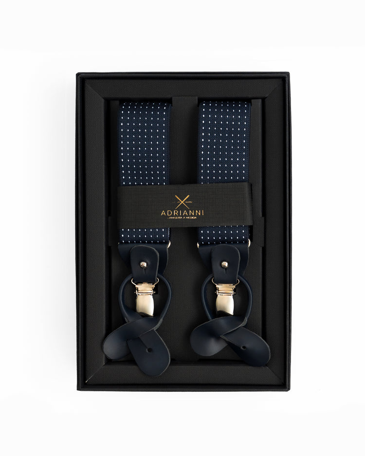 El azul marino aporta profundidad y sobriedad, mientras que el patrón de topos blancos introduce un matiz clásico que equilibra el conjunto con discreción.